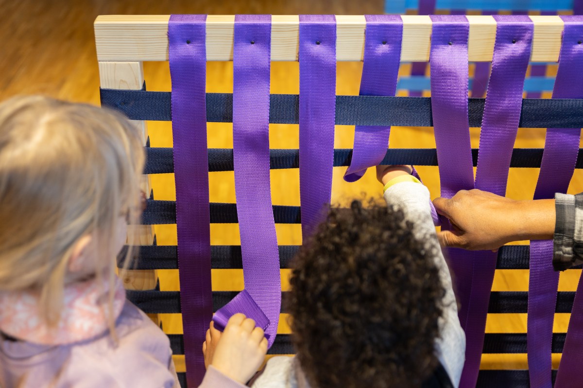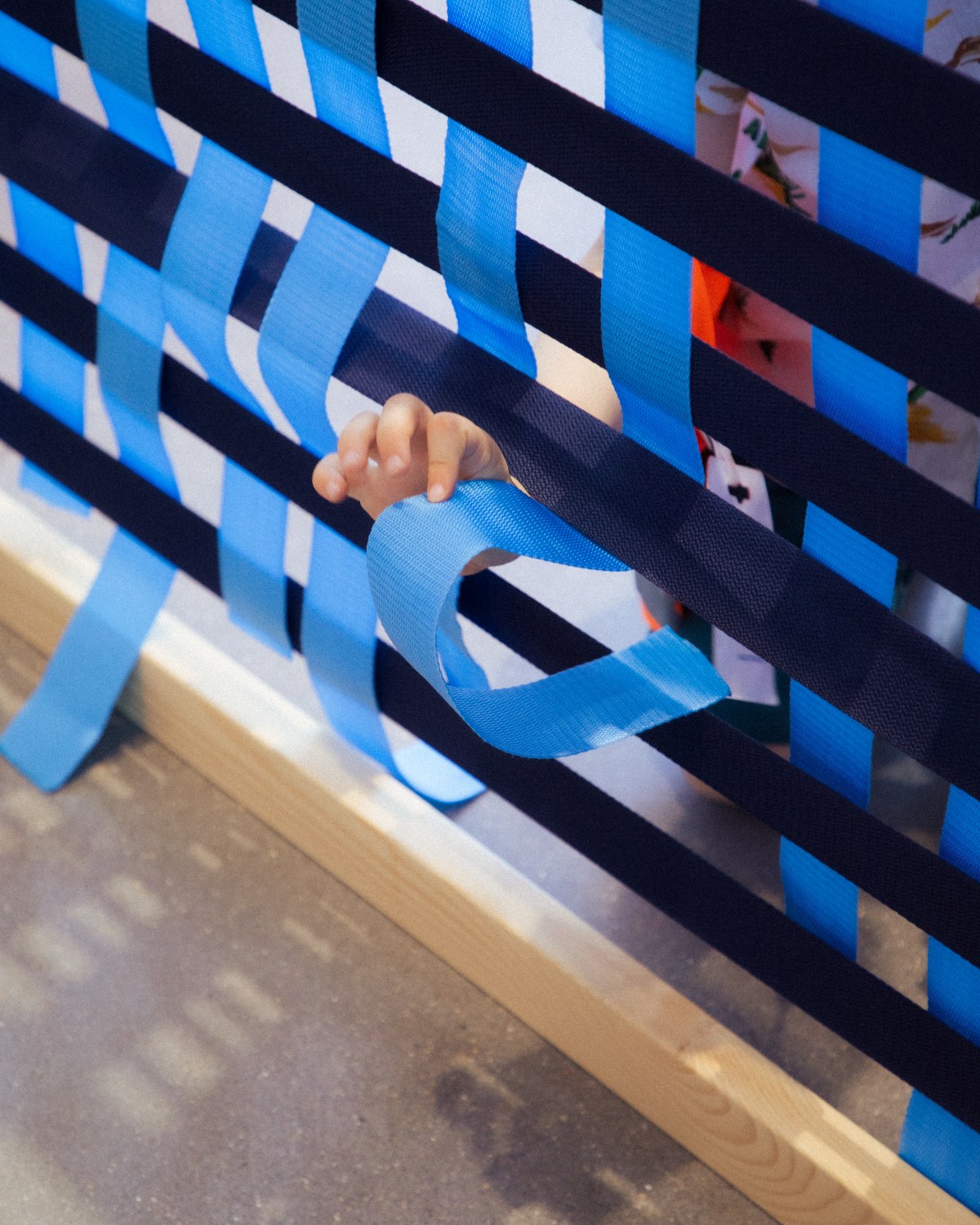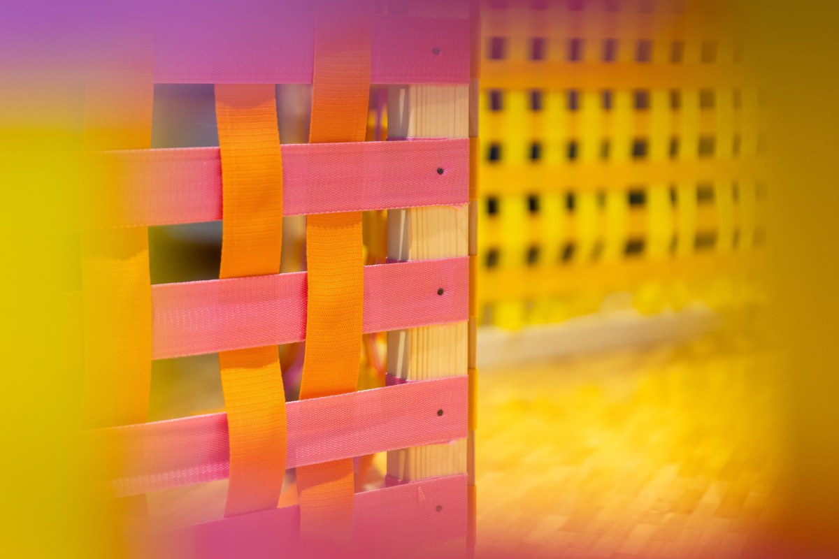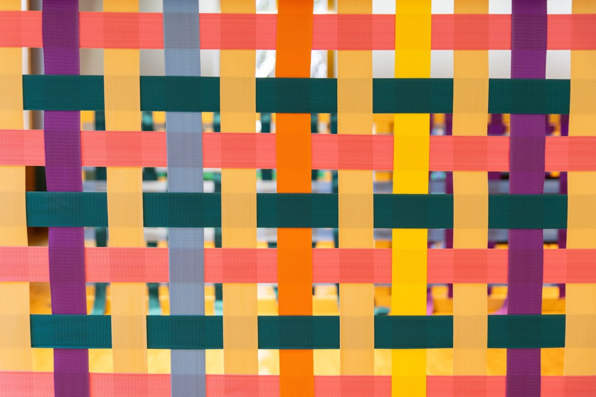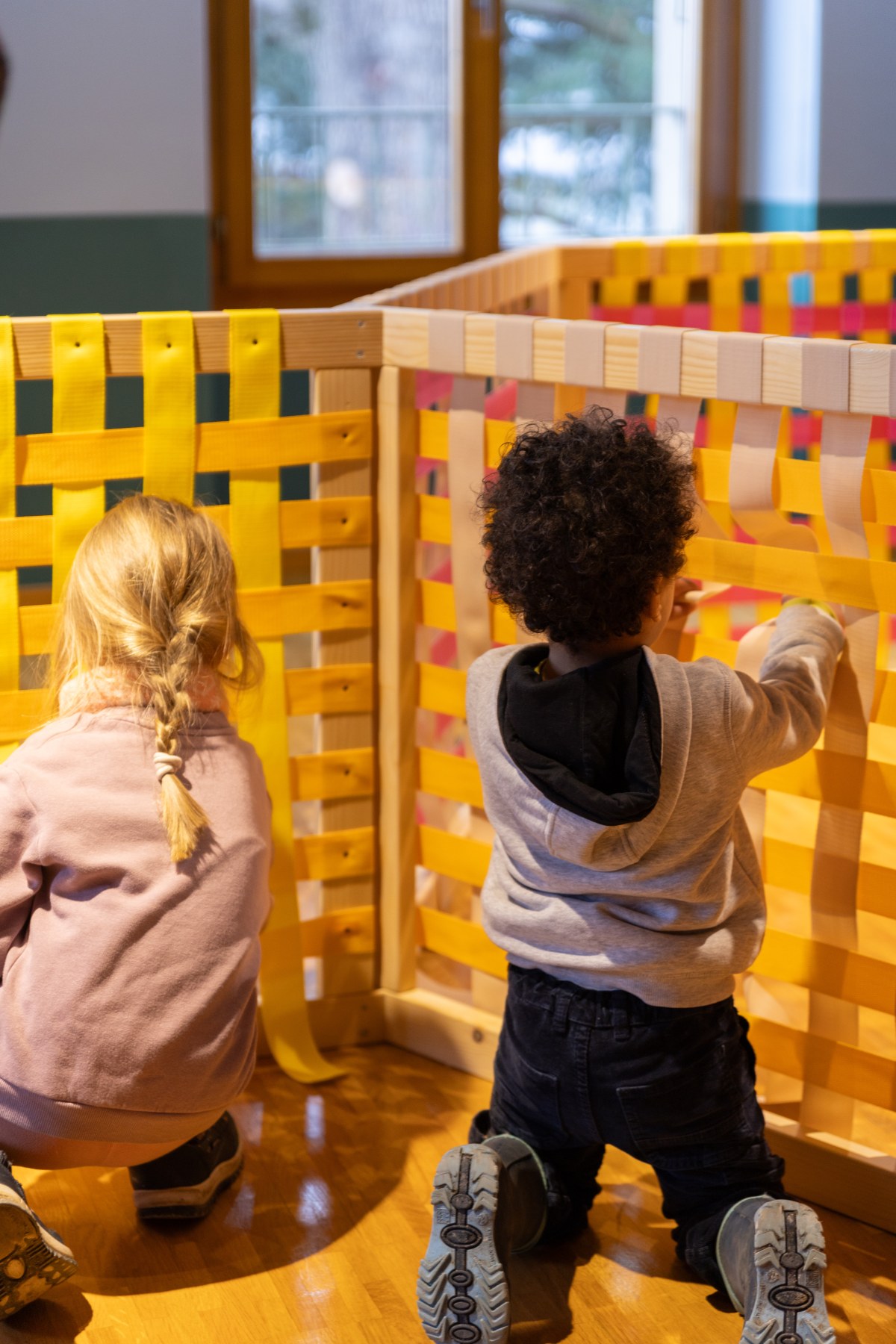 Composée de cadres en bois rappelant les métiers à tisser, cette installation à hauteur d’enfant permet d’expérimenter concrètement le croisement de la chaîne et de la trame à l’aide de sangles colorées. Cette approche interactive initie petits et grands à la sensibilité chromatique.