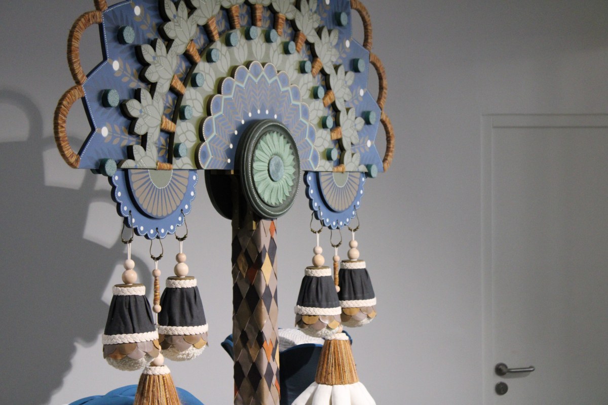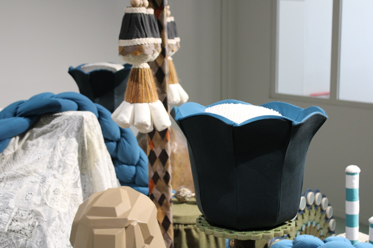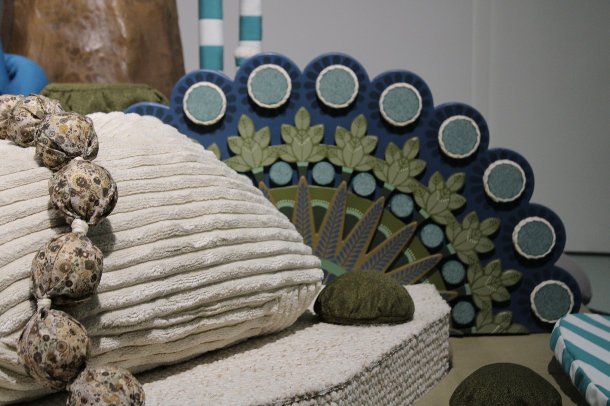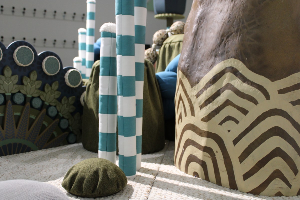 Koralie est fascinée par la nature, par tout ce qui la constitue, par l’effet d’infiniment grand que procure un paysage aux détails infiniment petits, comme l’observation de la phyllotaxie, cette façon si régulière qu’a la nature d’agencer les feuilles sur la tige d’une plante. Koralie peint et dessine des jardins flottants. Ces paysages sur papier ou sur toile prennent également place à différentes échelles, sur divers supports à l’intérieur comme à l’extérieur. À mille formes, elle propose de transposer ces jardins flottants à regarder en espace immersif, en 3 dimensions. C’est ainsi que l’artiste crée un nouvel espace où se mêlent des formes, des matières, des couleurs : des petites montagnes, des grandes feuilles, des constructions, des éléments mous, durs, brillants, permettant au tout-petit et à son accompagnateur de se plonger au sein de cette nature imaginée et d’en manipuler les moindres détails.