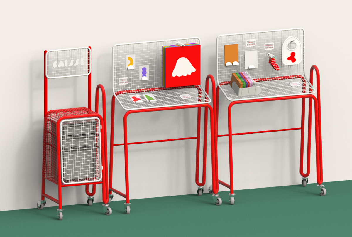 « L’éventaire » de mille formes est un ensemble de mobiliers et « quincailleries » destinés à la présentation, au stockage et à la vente de produits dérivés. Il est pensé par le designer Arthur Forestier comme un système modulable et évolutif capable de s’adapter aux besoins du lieu dans le temps. Ce projet prend racine dans l’histoire du bâtiment qui accueille mille formes, anciennement boutique, et sur le travail de mise en espace de la designer Laure Jaffuel, où les espaces intérieurs deviennent lieu de vie. Avec le café, l’agora et le playground, et s’il y avait un étal à mille formes ? C’est dans cet imaginaire familier du marché, du chariot de supermarché, des éléments de mises en rayons et des dispositifs d’étalage que le dessin du projet naît.